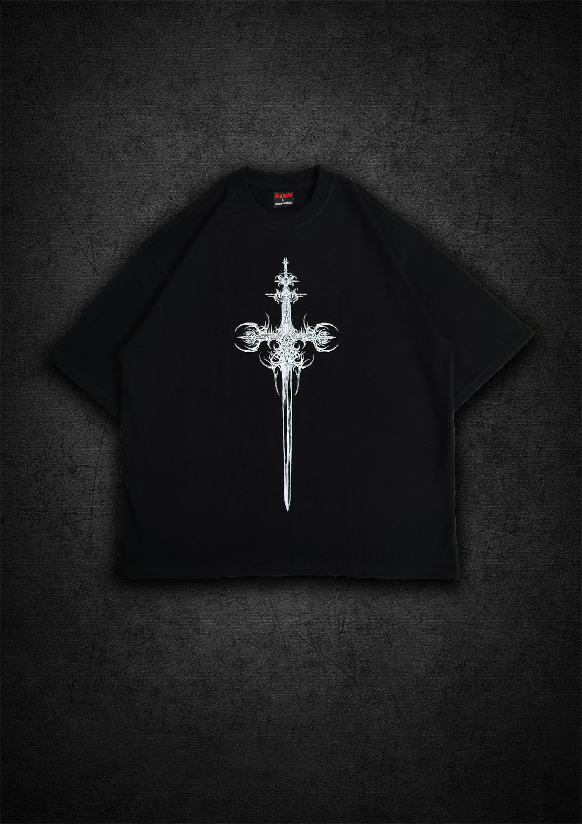 The Divine Blade Tee embodies power, chaos, and creation — merging gothic symbolism with modern minimalism. The front features a silver-etched sword-cross graphic, while the back reveals an intricate mirrored sigil, representing balance between faith and rebellion. Built for those who carry silence like strength, this tee defines Antophil’s raw yet elevated street identity.